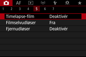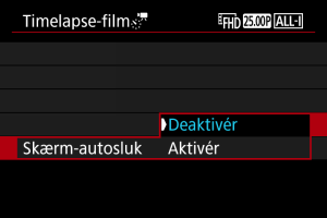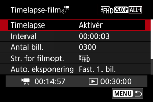 - Hvis du vil annullere optagelse af timelapse-film, skal du indstille [Timelapse] til [Deaktivér].