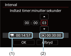 Angiver den tid, der er nødvendig for at optage det indstillede antal optagelser med det angivne interval. Hvis den overstiger 24 timer, vises “*** dage”.