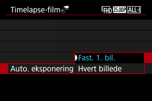 - Væsentlig ændringer i lysstyrke mellem optagelser kan forhindre, at kameraet kan optage ved det angivne interval, når [Interval] er indstillet til mindre end 3 sek., og [Auto. eksponering] er indstillet til [Hvert billede].