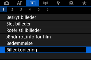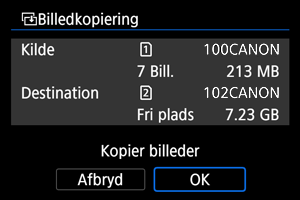 Hvis destinationsmappen eller kortet allerede har et billede med det samme filnummer, vises [Udelad billede og forsæt], [Erstat eksisterende billede] og [Annuller kopiering]. Vælg en kopieringsmetode, og tryk derefter på knappen