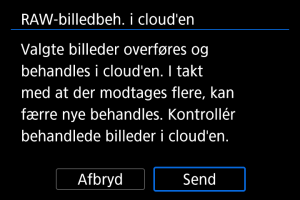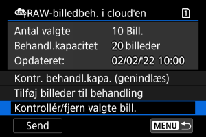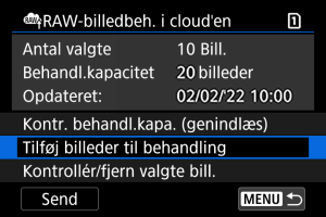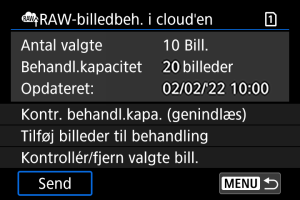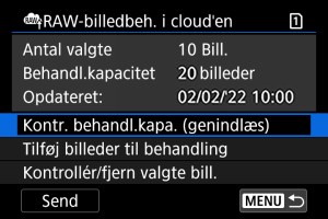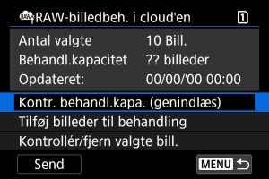 - [Behandl.kapacitet] er [0], medmindre du har et betalt abonnement til cloud RAW-billedbehandling. Du modtager oplysninger om abonnement på den e-mailadresse, som er registreret på image.canon, hvis du kontrollerer behandlingskapaciteten uden et abonnement.