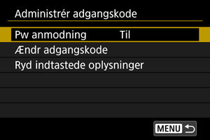 Brug disse indstillinger til at administrere den adgangskode, der indtastes, når afbryderen sættes til , eller kameraet fortsætter betjening fra autosluk. Se Indstilling af adgangskode for at få instruktioner om indstilling af den adgangskode, der kræves ved opstart af kameraet.