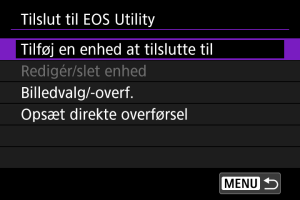 - Når der er oprettet en Wi-Fi-forbindelse til EOS Utility, er visse funktioner ikke tilgængelige.