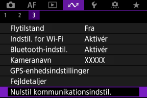 Alle indstillinger for trådløs kommunikation kan slettes. Ved at slette indstillingerne for trådløs kommunikation kan du forhindre, at deres oplysninger bliver vist, når du låner eller giver dit kamera til andre mennesker.