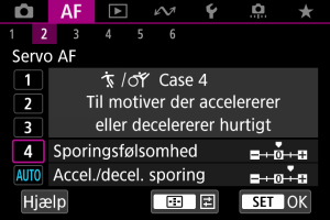 I følgende situationer skal du i stedet vælge [Case 2] til [Case 4]: motiver, der ikke bevæger sig, på tværs af AF-punkter, motiver, der er svære at finde, eller motiver, der er svære at holde fast i eller ændrer hastighed.