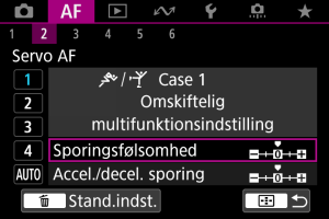 Kameraet vil forsøge at fortsætte med at fokusere på motivet, selvom en ting, der ikke er et motiv, går på tværs af AF-punkterne, eller hvis motivet glider væk fra AF-punkterne. Indstillingen -2 får kameraet til at holde styr på målmotivet længere end med indstillingen -1.