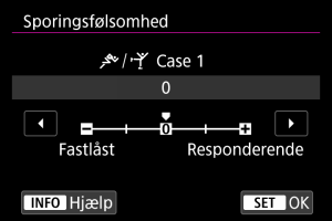 Kameraet kan fokusere på efterfølgende motiver på forskellige afstande, der er dækket af AF-punkterne. Også effektiv når du altid vil fokusere på det motiv, der er tættest på. Indstillingen +2 er mere responderende end indstillingen +1, når der fokuseres på det næste motiv.
