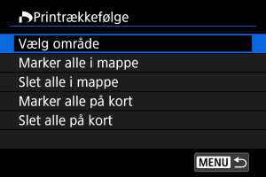 Vælg [Marker alle i mappe], og vælg mappen. Der angives en printrækkefølge for én kopi af alle billederne i mappen.