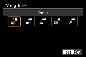 Du kan optage med filtereffekter. Filtereffekter kan forhåndsvises, inden du optager.