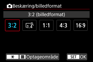 Du kan ændre billedformatet før optagelse. Du kan bruge [1,4x (beskær)] til at optage, som om du brugte et teleobjektiv, fordi denne indstilling forstørrer midten af billedet.