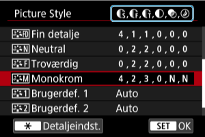 Du kan brugerdefinere en hvilken som helst Picture Style ved at ændre den fra standardindstillingerne. Du kan finde flere oplysninger om tilpasning af [Monokrom] under Justering af monokrom.