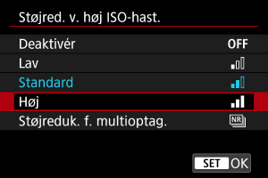 Du kan reducere den billedstøj, der genereres. Denne funktion er især effektivt ved optagelse med høje ISO-hastigheder. Ved optagelse ved lave ISO-hastigheder kan støjen i de mørkere områder på billedet (skyggeområderne) reduceres yderligere.