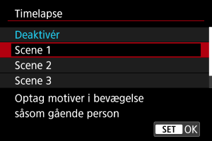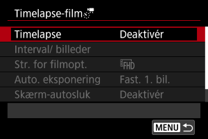 - Hvis du vil annullere optagelse af timelapse-film, skal du indstille [Timelapse] til [Deaktivér].