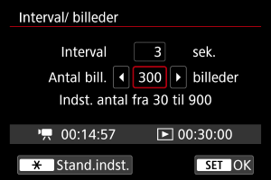 Angiver den tid, der er nødvendig for at optage det indstillede antal optagelser med det angivne interval. Hvis den overstiger 24 timer, vises “*** dage”.