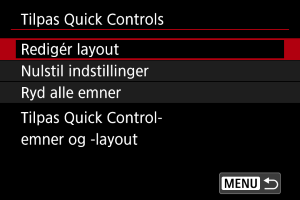 - Vælg [Ryd alle emner] for at fjerne alle elementer fra layoutet, så Quick Control-skærmen ikke vises, selv om der trykkes på