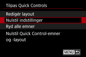- Vælg [Nulstil indstillinger] for at gendanne standard Quick Control-skærmpunkter og layout.