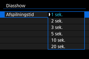 - Indstil [Afspilningstid], [Gentag] (gentaget afspilning), og [Overgangseffekt] (effekt ved billedskift) for stillbillederne.