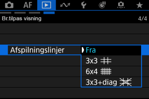 Du kan vise hjælpelinjer over stillbilleder, der er vist i enkeltbilledvisning på afspilningsskærmen. Denne funktion er nyttig til kontrol af billedets lodrette eller vandrette drejning såvel som komposition.