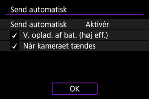 - [V. oplad. af bat. (høj eff.)]: Automatisk afsendelse starter, når videokameraet er slukket og sluttet til en strømkilde for at lade op via USB. Bemærk, at automatisk afsendelse starter, når videokameraet har været opladet et stykke tid, hvis den resterende kapacitet er lav i begyndelsen.