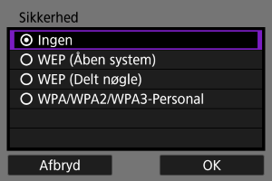 - Den samme sikkerhedstype skal indstilles på både den anden enhed og videokameraet. Se Metoder til godkendelse og datakryptering for detaljer om typer af godkendelse og kryptering.