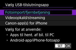 Når du har valgt [Videoopkald/streaming], skal du bruge interfacekablet til at oprette forbindelse til computeren og derefter starte programmet.