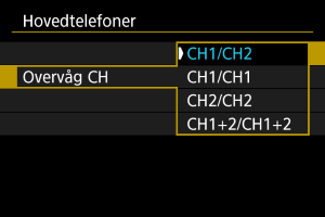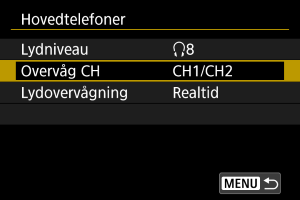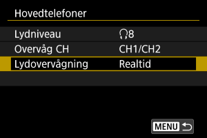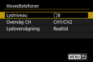 Du kan under filmoptagelse vælge den lyd, som bruges til output i hovedtelefonerne. For at reducere støj ved lydoptagelse skal du konfigurere [Lydstøjreduktion] ().