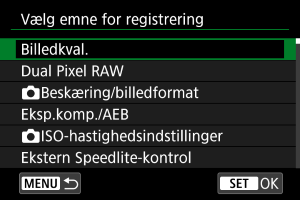 Du kan slette et hvilket som helst af de registrerede punkter. [Slet valgte emner] sletter ét punkt ad gang, og [Slet alle emner på faneblad] sletter alle de registrerede punkter på fanen.