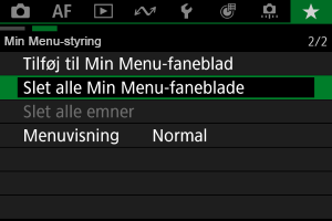 Du kan slette alle de Min Menu-faneblade, du har oprettet. Når du vælger [Slet alle Min Menu-faneblade], slettes alle fanerne fra [MY MENU1] til [MY MENU5] og fanen [] går tilbage til dens standardindstilling.