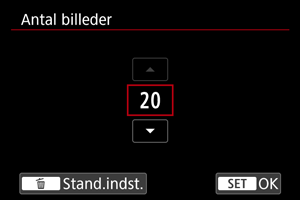 Med denne funktion er automatisk optagelse i fremføringsmetoden kontinuerlig optagelsestilstand allerede i gang, før du trykker udløserknappen helt ned, efter at du har trykket den halvt ned i et øjeblik. For at forberede pre-kontinuerlig optagelse skal du indstille antallet af billeder, der skal optages. [] vises på optagelsesskærmen under pre-kontinuerlig optagelse.