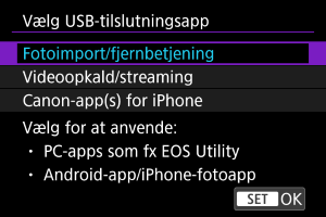 Vælg, om du vil brug EOS Utility, når du har oprettet forbindelse til en computer, eller om du vil bruge Android-appen eller iOS-versionen af billederne.