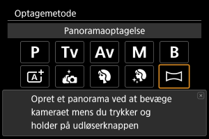Panoramaer laves ved at kombinere optagelser, som er taget under kontinuerlig optagelse, når du bevæger kameraet i en retning samtidig med, at du trykker udløserknappen helt ned.