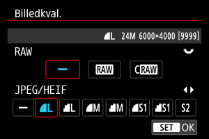Du kan vælge antal pixels og billedkvaliteten. Der er følgende indstillinger for JPEG-/HEIF-billedkvalitet: /