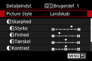 Du kan vælge en standard-Picture Style som [Portræt] eller [Landskab], justere den efter behov og registrere den under [Brugerdef. 1] – [Brugerdef. 3]. Det er nyttigt, når du opretter flere Picture Styles med forskellige indstillinger.