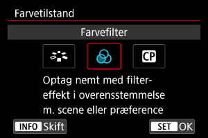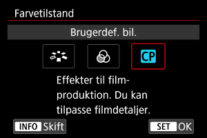 Du kan indstille dine foretrukne film- eller stillbilledeegenskaber fra menuen Picture Style, Farvefilter eller Brugerdefineret billede.