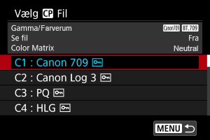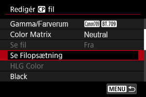 - En registreret look-fil kan ikke bruges, hvis du ændrer indstillingerne for [Gamma/Color Space], [HLG Color] eller [Over 100%] efter registrering.