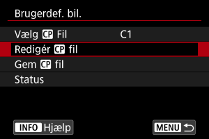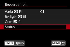 Du kan gennemgå indstillingerne for brugerdefinerede billedfiler i menuen [Brugerdef. bil.].