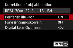- [Kromat. aber.kor.] vises ikke, når [Digital Lens Optimizer] er indstillet til [Standard] eller [Høj].