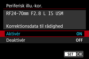 - Det anbefales at indstille korrektionerne til [Deaktivér] ved brug at et objektiv, der ikke er fra Canon, selv hvis [Korrektionsdata til rådighed] vises.