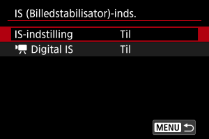 Aktiverer billedstabilisering ved hjælp af objektivets IS. Vises, når der bruges IS-objektiver uden IS-kontakt. Vises ikke for andre objektiver.