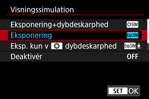 Med skærmsimulation kommer billedlysstyrken og dybdeskarpheden tættere på den faktiske lysstyrke (eksponering) på dine optagelser.