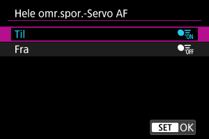 Du kan indstille til, hvorvidt der skal skiftes til at motivsporing i hele området i forbindelse med Servo AF (samtidig med at udløserknappen er trykket halvt ned med [: AF-funktion] indstillet til [Servo AF]).