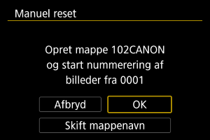 Når du nulstiller filnummereringen manuelt, oprettes automatisk en ny mappe, og filnummereringen af billeder gemt i den mappe, begynder fra 0001.