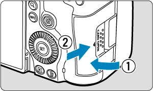 - CFexpress-kort indsættes i den bageste port, og SD-kort indsættes i den forreste port.