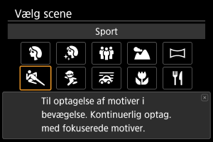 Brug [] (Sport) til at optage motiver i bevægelse, som f.eks. løbere eller et køretøjer i bevægelse.
