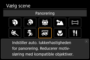 Monter et objektiv, der er kompatibelt med [] (Panorering) for at reducere sløring af motivet.