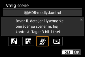 - HDR-modlyskontrol vil måske ikke være effektiv for scene, der er kraftigt baggrundsbelyst eller har ekstremt høj kontrast.