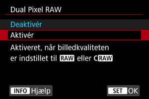 -billeder med denne funktion aktiveret giver særlige Dual Pixel RAW-billeder, der indeholder dual pixel-oplysninger fra billedsensoren. Dette kaldes Dual Pixel RAW-optagelse.