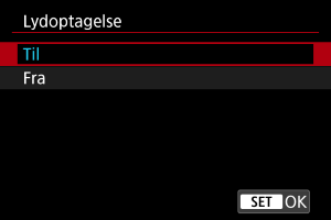 Vælg [Til] for lydoptagelse under filmoptagelse. Den indbyggede mikrofon bruges til optagelse, medmindre du bruger eksterne mikrofoner eller mikrofoner, der er beregnet til multifunktionsskoen.