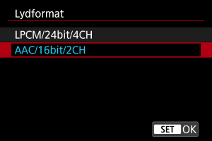 - Hvis du vælger [LPCM/24bit/4CH], kan du optage lyd i fire kanaler. Hvis du vælger [AAC/16bit/2CH], begrænser du optagelsen til to kanaler (med en enkelt mikrofon).