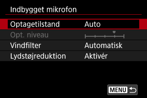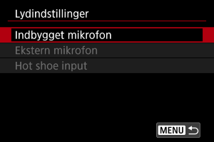 Konfigurer mikrofoner til lydoptagelse i disse indstillinger. Når du bruger eksterne mikrofoner eller mikrofoner, der er designet til en multifunktionssko, skal du også se instruktionsmanualen til mikrofonen.